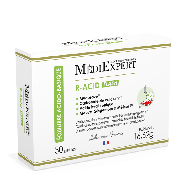 Acidité gastrique. À base de Carbonate de Calcium, plantes et Acide hyaluronique.