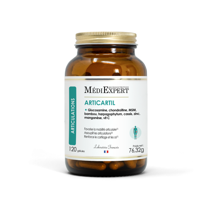 Articartil est un complément alimentaire pour soutenir les articulations1 en particulier le cartilage et les os. Il associe des molécules de référence (glucosamine végétale et chondroïtine) à des extraits végétaux titrés en actifs ainsi qu'à des vitamines et minéraux essentiels.