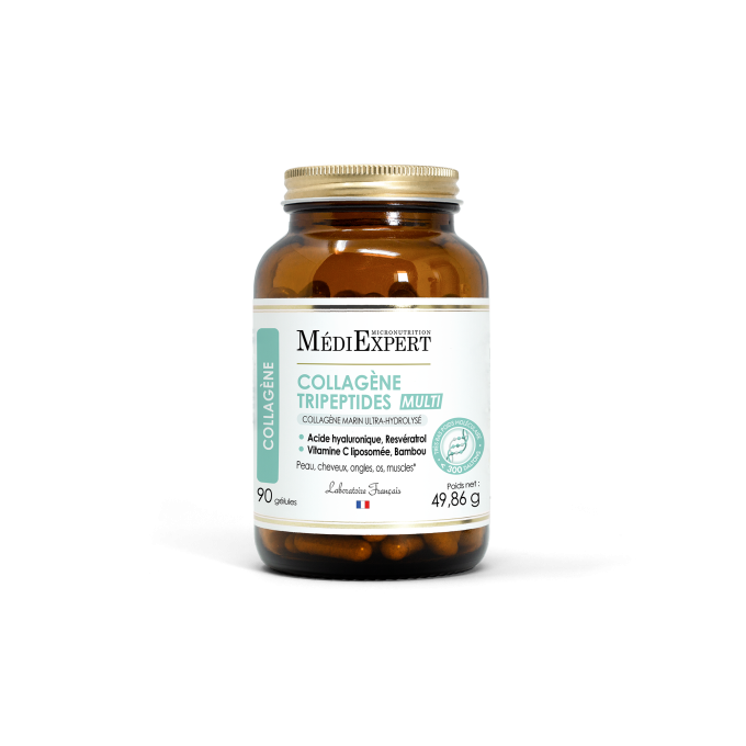 Médiexpert Collagène Tripeptides Multi est un complément alimentaire conçu pour répondre à des besoins variés : peau, cheveux, ongles, os, muscles... Sa formule experte, en format gélules, associe du collagène marin ultra-hydrolysé à de l'acide hyaluronique, du resvératrol, un extrait de bambou et de la vitamine C liposomée pour de multiples bénéfices !