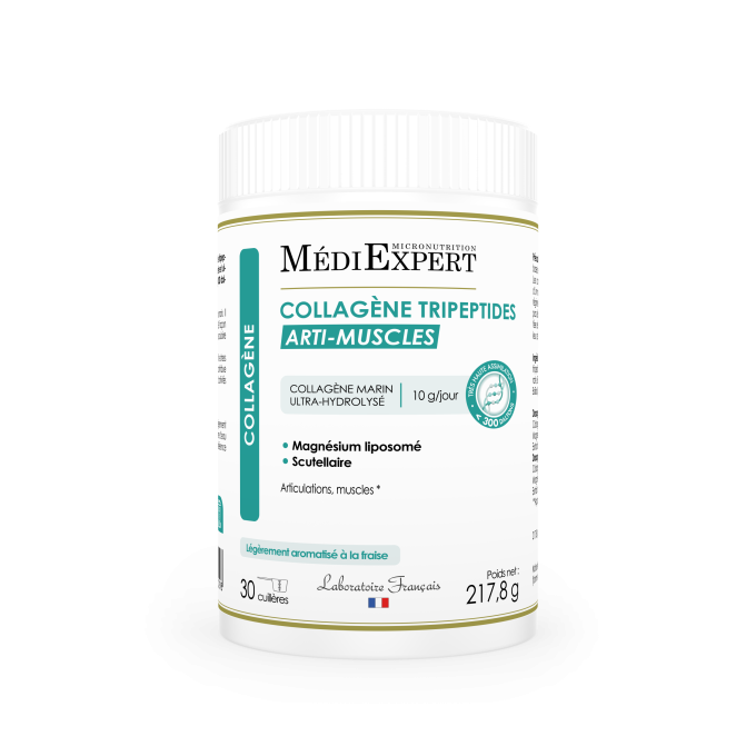 Médiexpert Collagène Tripeptides Arti-Muscles est un complément alimentaire formulé pour soutenir la santé articulaire1 et la fonction musculaire2 ! Il associe du collagène marin ultra-hydrolysé (concentré en tripeptides) à du magnésium2 liposomé et un extrait de scutellaire.