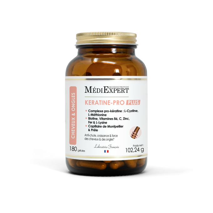 Kératine Pro Plus est un complément alimentaire formulé pour soutenir la croissance et le renforcement des cheveux1. Sa formule experte "pro-kératine" associe des acides aminés soufrés essentiels à la formation de kératine, à des vitamines, minéraux et extraits végétaux ciblés.