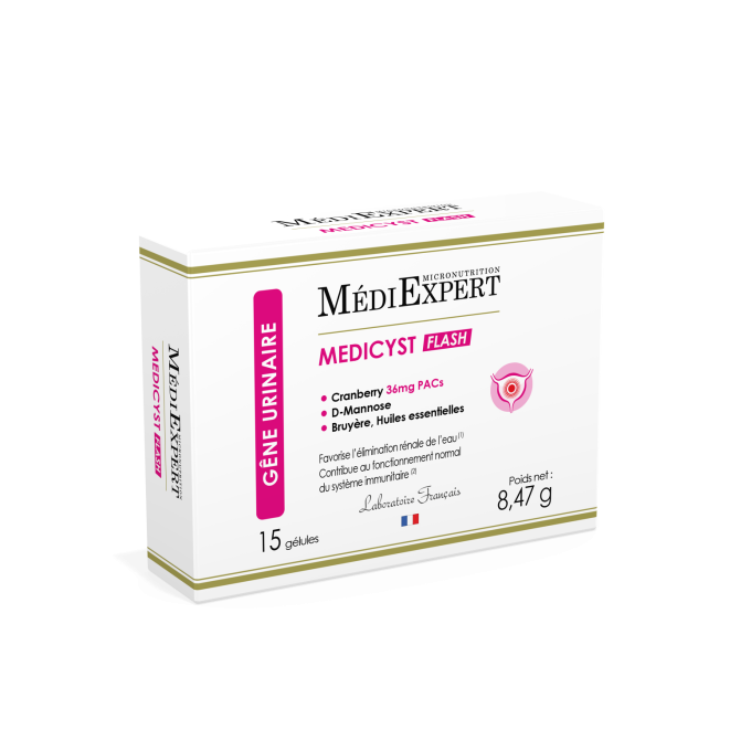 Médicyst Flash, format gélule, est un complément alimentaire développé pour les premiers signes d'inconforts urinaires. Sa formule ciblée apporte du D-Mannose, de la Cranberry, de la Bruyère, de la Busserole, du Zinc et des huiles essentielles.