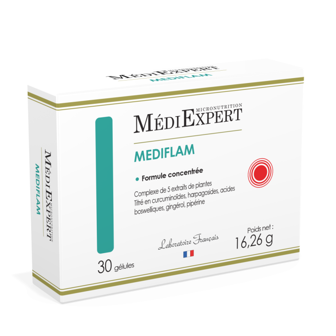 Médiflam est un complément alimentaire à base d'un complexe de 5 extraits de plantes titrés en actifs : Curcuma, Harpagophytum, Boswellia, Gingembre et Poivre noir.