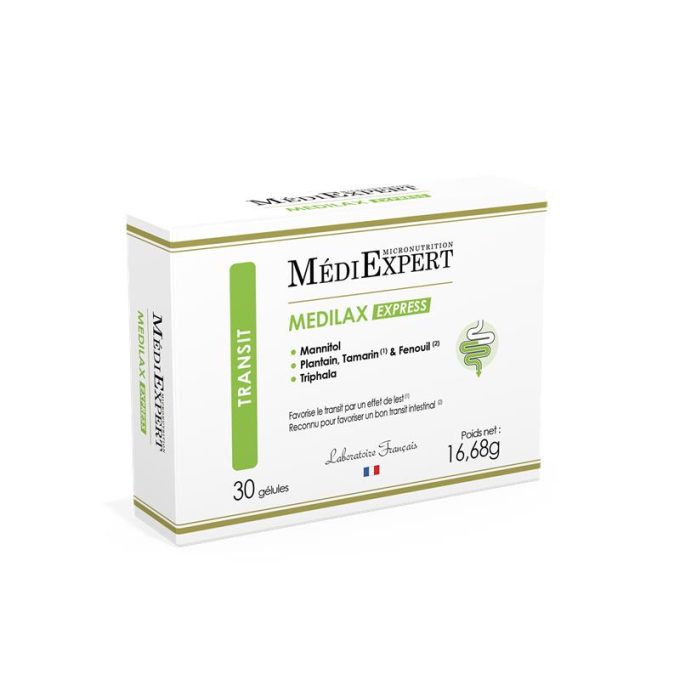 Médilax Express est un complément alimentaire qui favorise le transit par un effet de lest grâce au Tamarin1. Sa formule est concentrée en mannitol et associe des extraits de plantes reconnues : Plantain, Tamarin, Fenouil & Triphala (issu de la tradition ayurvédique).