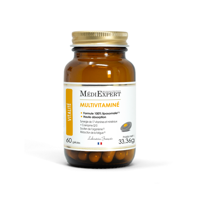 Médiexpert Multivitaminé est un complément alimentaire qui associe les 13 vitamines essentielles, à 4 minéraux et du Coenzyme Q10. Une formule complète 100% liposomale*, conçue pour couvrir les besoins nutritionnels quotidiens.