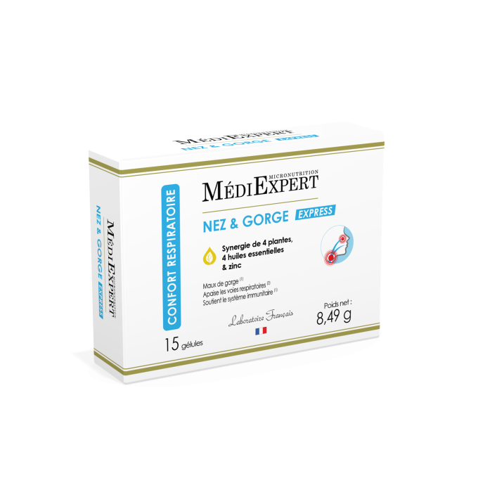 Médiexpert Nez & Gorge Express est un complément alimentaire adapté au confort respiratoire. Sa formule originale associe 4 plantes, 4 huiles essentielles et du zinc pour une action synergique ciblée.