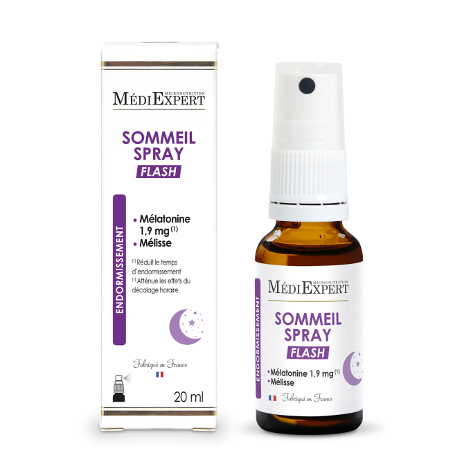 Médiexpert Sommeil Spray FLASH est un complément alimentaire à action rapide, spécialement conçu pour favoriser l’endormissement. Sa formule concentrée associe de la mélatonine¹ et de la mélisse², pour une détente optimale et un sommeil de qualité, même en cas de décalage horaire.