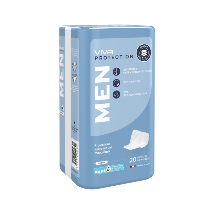 Les protections anatomiques VIVA MEN sont spécialement conçues pour répondre aux besoins des hommes confrontés à des fuites urinaires légères.